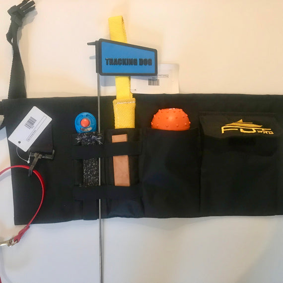 Apron with compartments for all our tracking essentials. Holds the articles, the flag, an extra leash or grab line, tug, ball, and bait!!!
