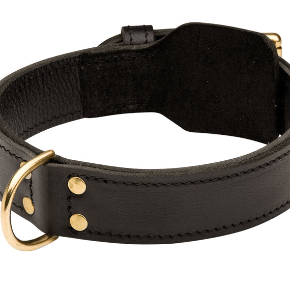 Made in Europe of 100% full grain genuine leather with brass fittings and fur protection plate, this collar is practical and stylish. 1.5 in wide double ply it is comfortable and strong for agitation work.